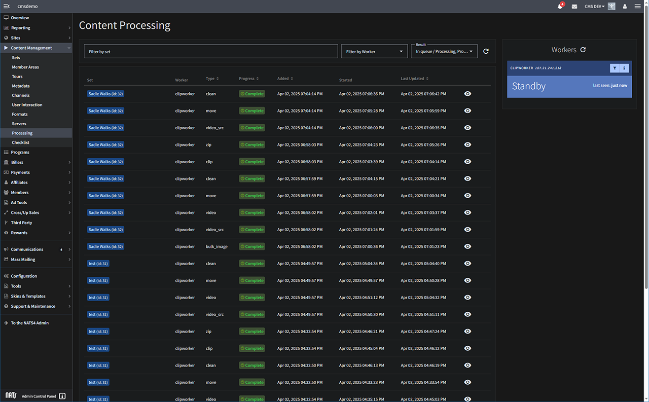 Every tool you need to manage your content is included. Whether you choose to create a new content set in the admin panel and upload the content with your browser, or upload content to your server and create directly from those files, full control of your content library is at your fingertips. NATS will automatically generate everything needed, including thumbnails, SFW thumbnails, video preview clips, and transcode videos into other formats if desired.