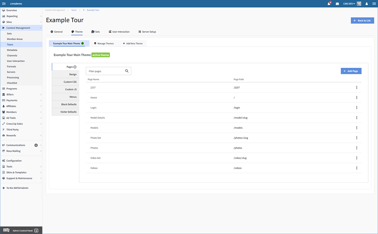 As with everything in NATS, the CMS is unlimited. Create as many tours and member areas as you would like. Our default Bootstrap-based theme is mobile friendly and provides a great starting point for any site. Unsure of what to build? Quickly make a copy of your theme and modify it while leaving your live site unaffected. Once your changes are ready, simply activate your new theme.