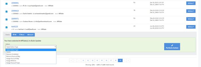 At the bottom of the Affiliates Table, you will find batch options for the affiliates. Clicking the "All" button will check all of the affiliates on that page to perform a bulk update while clicking the "None" button will make sure none of the affiliates on that page are checked. The "Invert" button will check the unmarked affiliates and uncheck the marked affiliates. The available bulk update actions are: