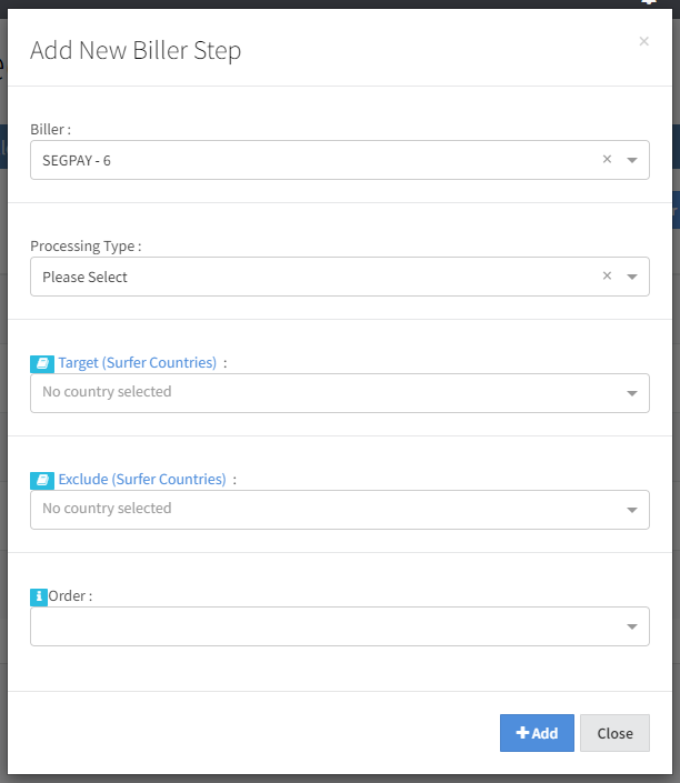 To add a special step, click the "Add Special Step" button next to the "Add Biller Step" button at the top-right of the tab page. A widget will appear, where you will have to fill in unique information for the special step.