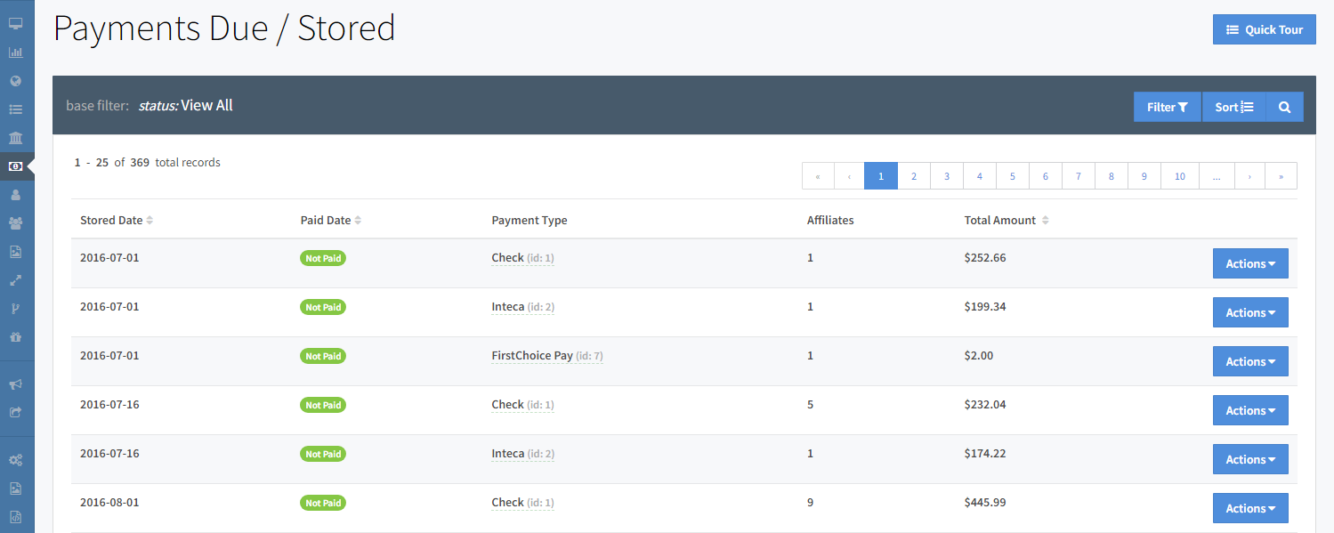 The Payments Due/Stored page displays all of the payments to affiliates that have been stored in your NATS. You can access this page by going to the Payments section and clicking "Payments Due / Stored".