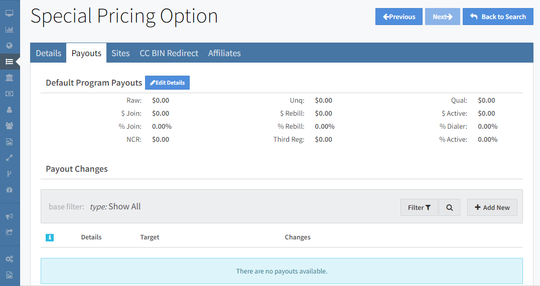 If you decide to offer your special pricing program as a Pay-Per-Sale (PPS) program, you should ensure that your special program does not use your default Payouts (especially if your special join option costs less than your standard join options). You can do this by navigating to the "Payouts" tab of the Program and clicking the "Add New" button under the Payout Changes section.