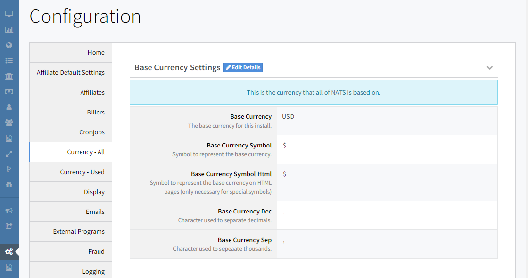 NATS records all transactions in its base currency. This base currency, which is usually set to U.S. Dollars (USD), is set during the installation of your NATS build and cannot be changed. NATS only records transactions in its base currency, but you can create join options that will accept other countries. However, you must first tell NATS what exchange rate to use.