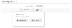 Next, click on the "Sites" tab and locate your third party site and tour. Once you have found it, click on the "Enable" checkbox next to the site so that the site and tour are enabled with the third party program.
