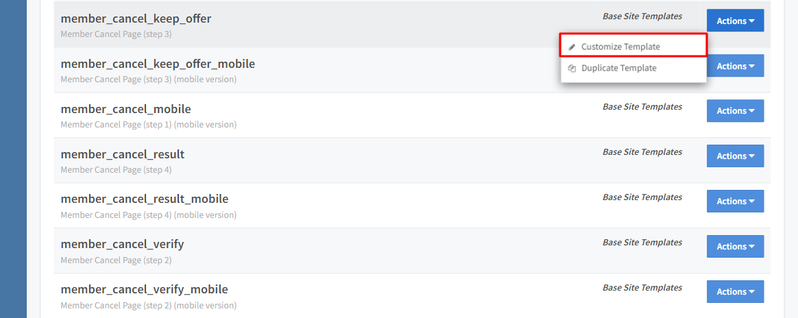 To customize the look and feel of the page for this step, navigate to the [Sites Admin ](https://docs.toomuchmedia.com/nats-admin/sites)and select the [Site Templates](https://docs.toomuchmedia.com/nats-admin/sites/site-templates) tab. Search for the member\_cancel\_keep\_offer template, select the associating Action button, and click "Customize Template".&#x20;